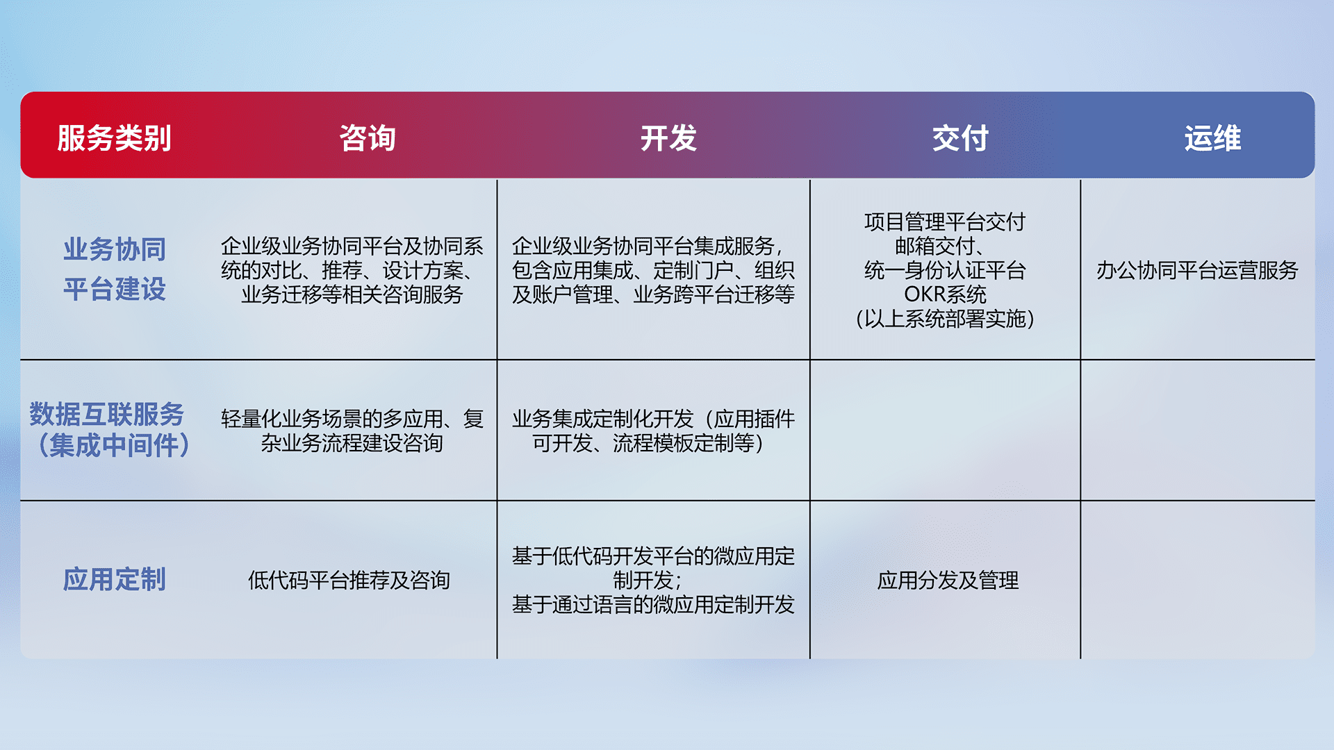针对钉钉、、、企微、、、IDaas等平台级产品提供产品的规划、、、、方案、、、、交付、、定制化开发等服务,,,,实现如统一协同办公、、、、智能客户服务、、、混合会议管理、、、智能数据查询、、、等业务场景,,,,实现数字化转型。。。。